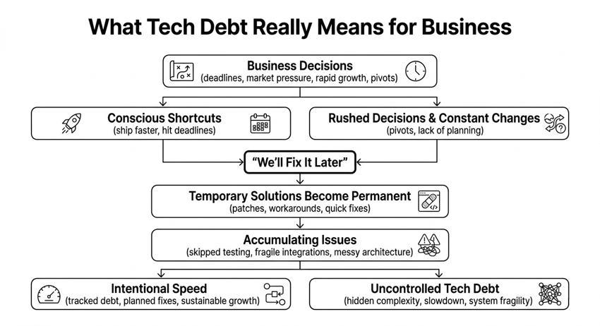 Tech debt is often misunderstood as a purely ”technical problem”. Many think of it as something buried deep in code that only engineers worry about. In reality, it starts much earlier. It begins with your business decisions.